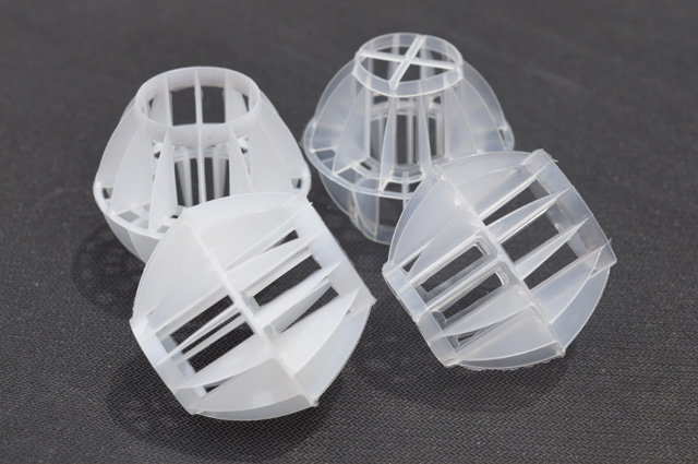多面空心球中間鏤空結(jié)構(gòu)形成空隙大,不易被阻塞的特性。這種結(jié)構(gòu)在空氣洗滌、廢氣吸收、灰塵過(guò)濾等廢氣處理工程方面應(yīng)用,具有處理風(fēng)量大、阻力小的特點(diǎn)。由于多面空心球的空隙中有較高的滯液量,可使塔內(nèi)液體停留時(shí)間長(zhǎng),從而增加了氣體與液體的接觸面積和接觸時(shí)間,便廢氣得到充分吸收處理。